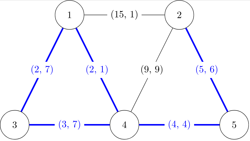 每条边都标有一个对 $(l, c)$,表示其长度为 $l$ 米,费用为 $c$ 美元。
