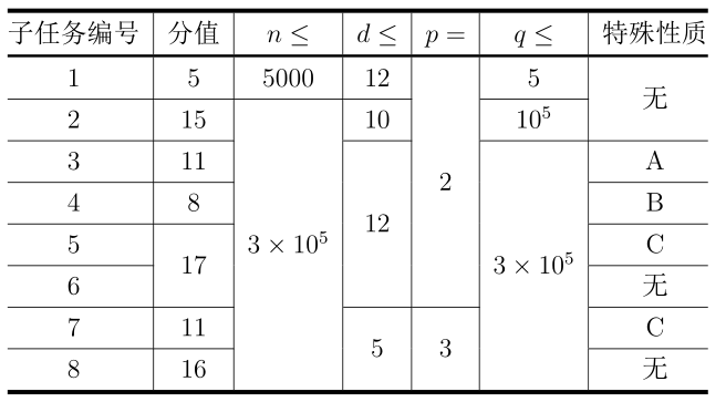 - $1 \le n \le 3 \times 10^5$,$0 \le d \le 12$,$p \in \{2, 3\}$;