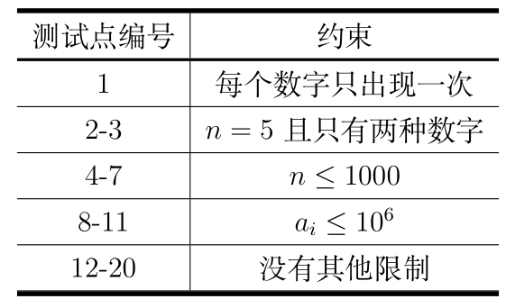 对于所有数据,$1\leq n\leq 5\times 10^5,1\leq a_i\leq 10^9$。每个测试点的具体限制见下表: